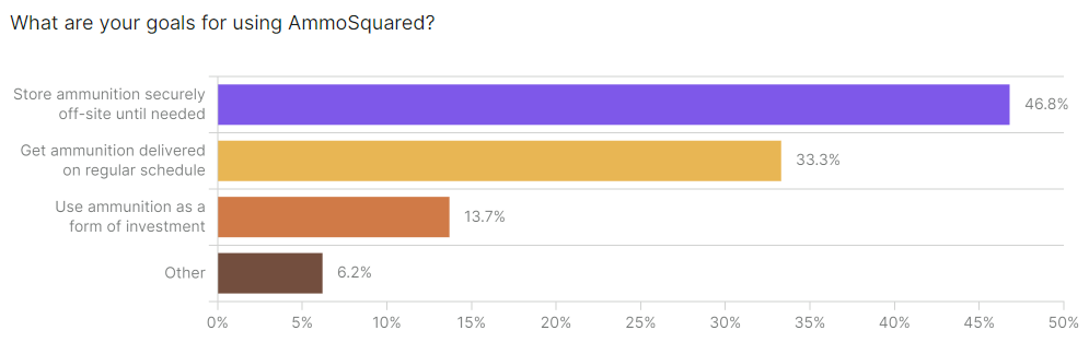In another similar question we asked: "What motivates you to choose AmmoSquared for at least some of your ammunition needs?" Customers could choose multiple answers (which is why the percentages don't total) These are the top three motivations that surfaced:
