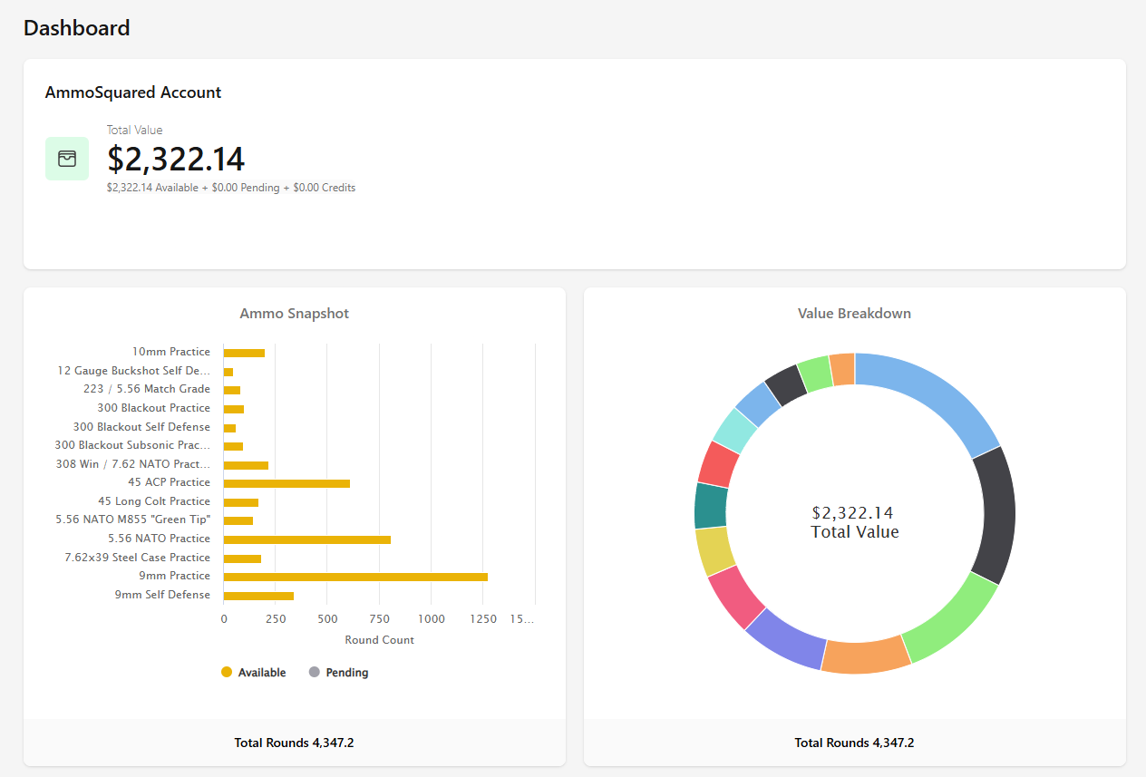 You can see I have a pretty diversified portfolio or 4,347.2 rounds spread across 14 caliber variations, currently valued at $2322.14. I have a mix of pistol (9mm, 45ACP, 10mm), rifle (5.56, 7.62 Nato, 7.62x39, 300BLK) and shotgun (12ga Buckshot). I contribute about $50 per paycheck to my account and avoid taking ammo out unless I really need it.